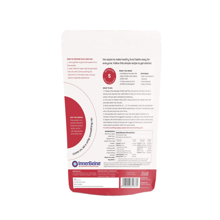 InnerBeing's vegetarian millet pancake mix is a delicious gluten and sugar free mix packed with pea protein and powerful spices. Prepare appetizing pancakes for you and your family to kick start an energetic day.