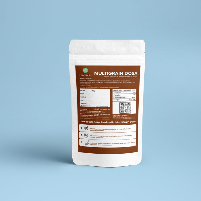Realvedic Multi Grain Dosa mix is a rich source of plant-based proteins and dietary fibers. Anti-inflammatory and anti-oxidant-rich spices have been included to help build immunity. One-of-a-kind dosa mix formulation with 15 natural and nutritious ingredients. Great tasting dosas with less effort and the pleasure of eating dosas made with natural and nutritious ingredients.
