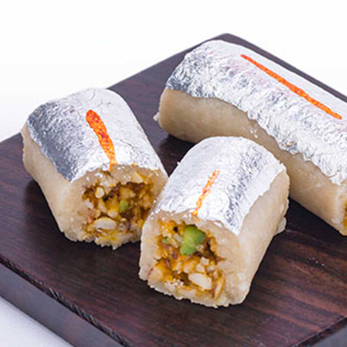 Experience the luxury of Dryfruit Roll from Mahalaxmi Sweets, Jalgaon – a perfectly balanced blend of cashewnuts, almonds, pistachios, and aromatic cardamom, elevated with the richness of saffron (keshar). Every bite of this delicacy offers a luscious sweetness, thanks to the pharma-grade sugar, and is finished off with a sparkling touch of silver leaves (chandi waraq). The combination of crunchy dryfruits and the soft, melt-in-your-mouth texture makes this roll a heavenly treat for those who love a touch of luxury in every bite.