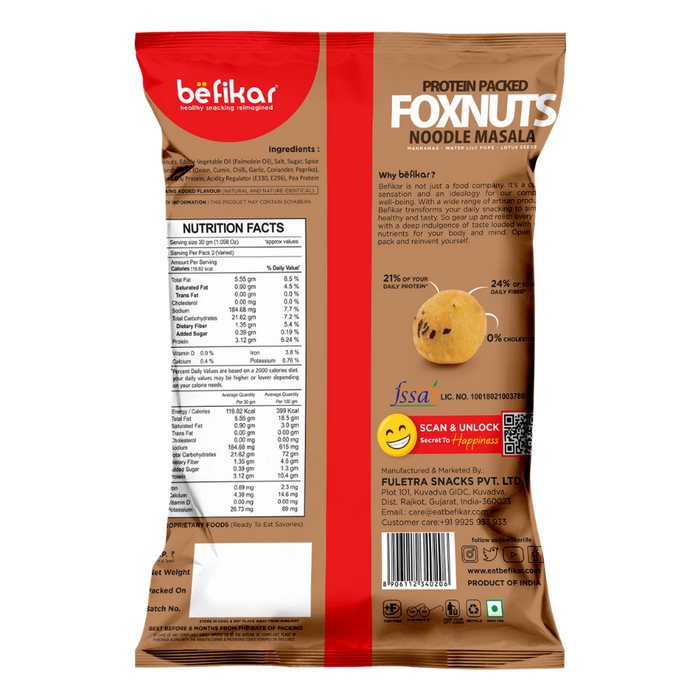 - Contains Foxnuts, Edible Vegetable Oil (Palmolein Oil), Salt, Sugar, Spice, and Condiments (Onion, Cumin, Chilli, Garlic, Coriander, Paprika), Hydrolyzed Soy Protein, Acidity Regulator (E330, E296).