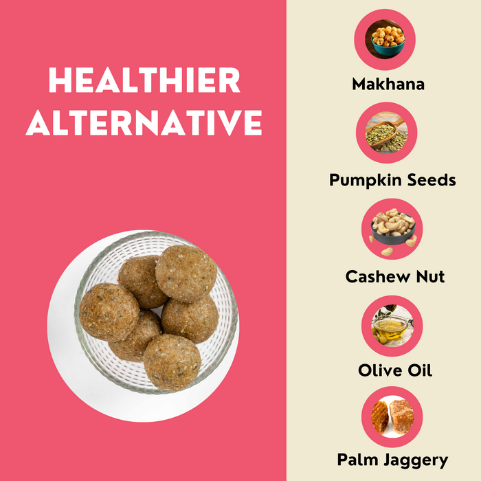 - Contains Makhana/ Foxnut, Pumpkin Seeds, Cashew Nut, Palm Jaggery, Shredded Coconut Flakes, Cardamom Powder & Dash of Extra Virgin Olive Oil