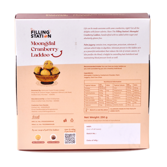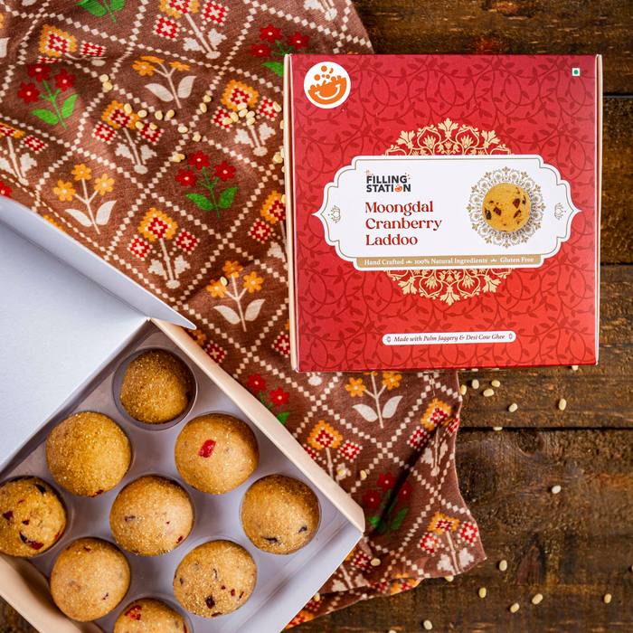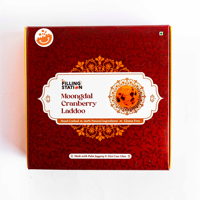 Saliva starts drooling whenever the name Moongdal ladoo comes to our mind, as we get transported back to the days when grandma used to prepare these laddoos and feed us. Still remember the unforgettable taste and the aroma. Alas! As we have become conscious about healthy living, we have forgotten these small-small pleasures of indulging in eating sweets. Leading a life without indulging your sweet craving is very sad. So no more sadness, here comes the Moongdal Cranberry Laddu from The Filling Station, tempting you with those unforgettable tastes and aroma but with no presence of harmful refined sugar. We prepare them lovingly with Palm jaggery that has a much less glycemic index, giving us the pleasure to indulge them the way we want. Till now we never knew of the immense health benefits these laddoos have…. these are just so nutritious.