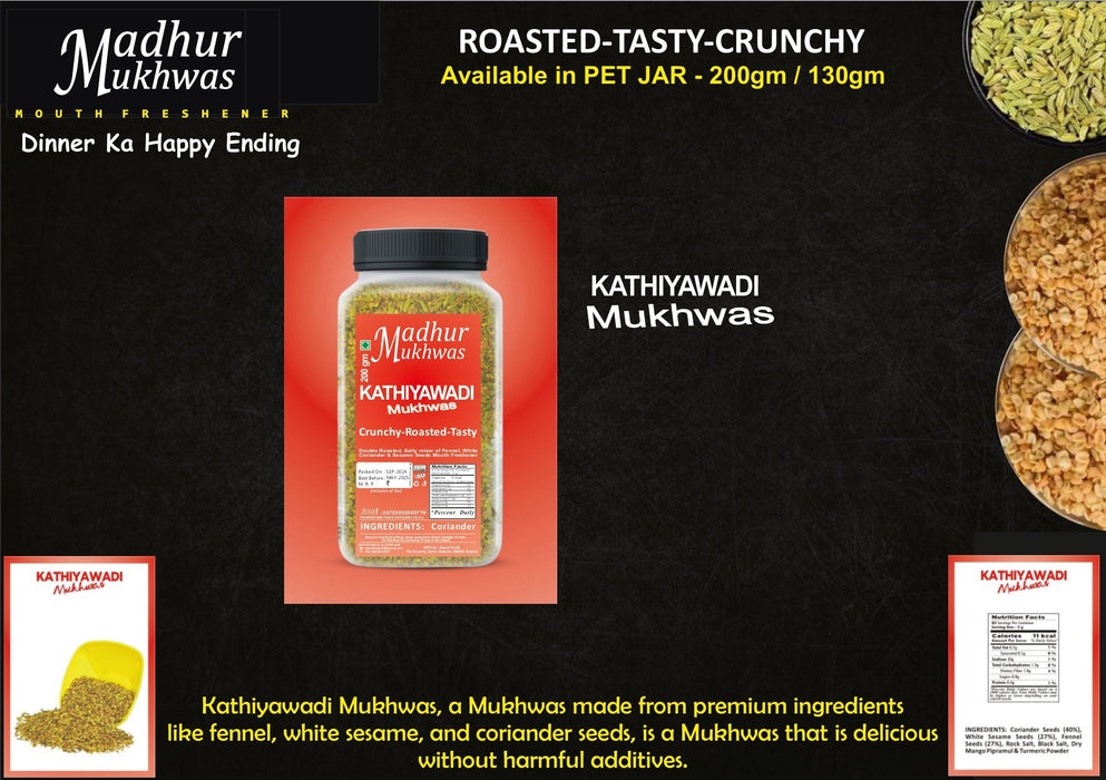 Experience the mouthwatering delight of Madhur Mukhwas Roasted Kathiyawadi, carefully crafted with premium ingredients like fennel, white sesame, and coriander seeds. Made without any harmful additives, this Mukhwas is an irresistible treat for your taste buds.