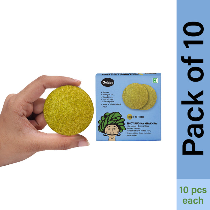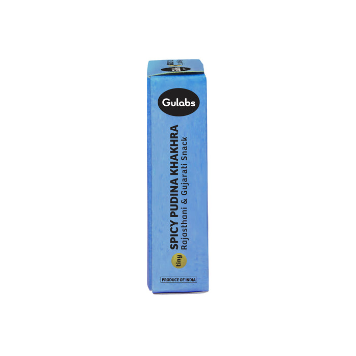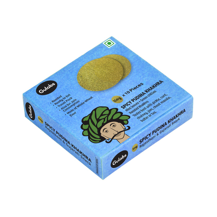 Experience a burst of flavors with Gulabs Tiny Spicy Pudina Khakhra - A crispy, roasted whole wheat snack infused with the refreshing zest of mint leaves and a tantalizing hint of green chillies. Handcrafted in Chennai, these bite-sized khakhras are perfect for satisfying your snack cravings anytime, anywhere.