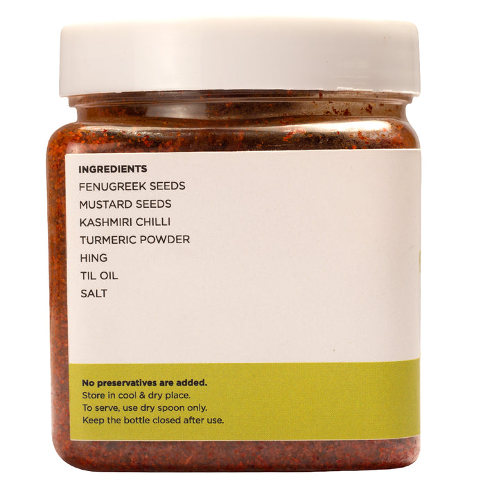 - Contains Fenugreek seeds, Mustard seeds, Chilli powder, Oil, Asafoetida