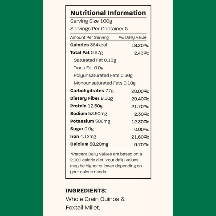 - Contains Whole Grain Quinoa & Foxtail Millet.