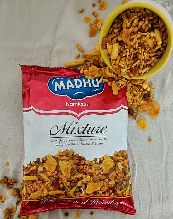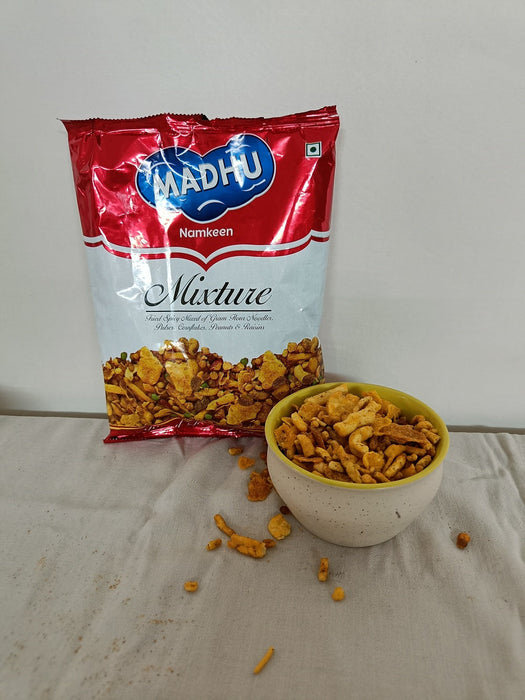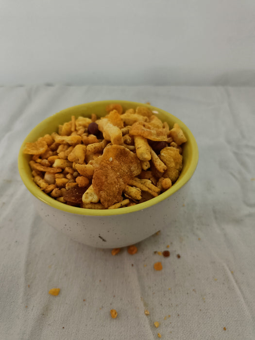 Fried Spicy Mixture Of Gram Flour Noodles, Pulses, Cornflakes, Peanuts & Raisins. This delicious mix is a must-have at every home. It can enjoy with tea or just can be munched anytime, anywhere!!