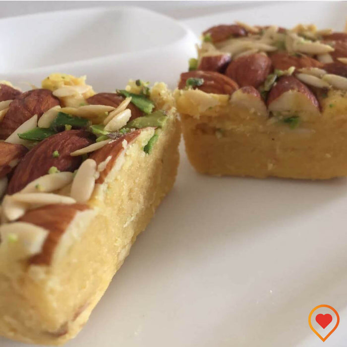 Gram Flour (Besan), Desi Ghee, Sugar, Cardamom, Garnished with Pistachios.