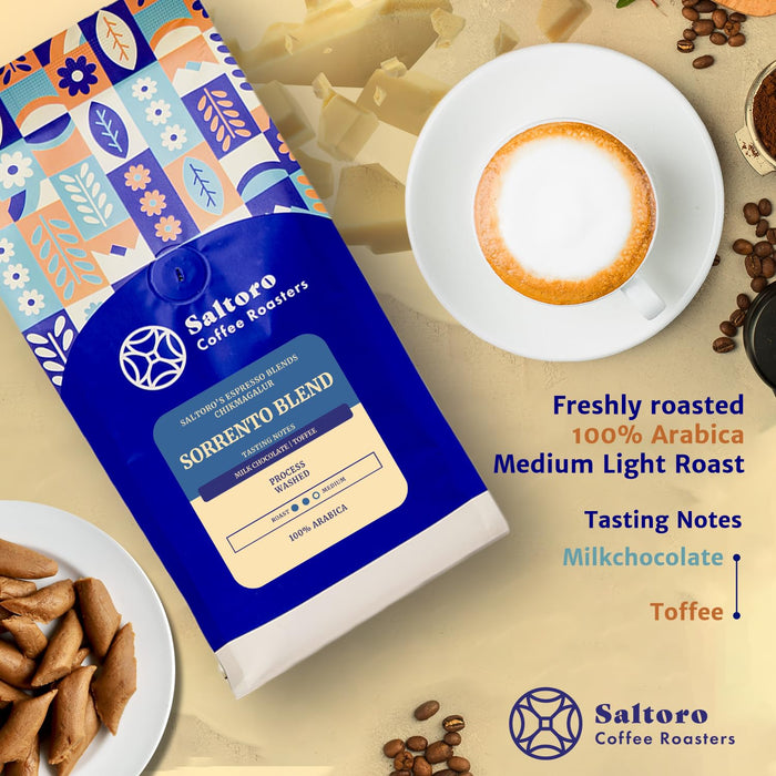 Embark on a sensory journey with Saltoro Coffee Roasters' Sorrento Blend, a medium roast premium coffee that encapsulates the essence of Chikmagalur's finest Arabica beans. Meticulously crafted and 100% Arabica, Sorrento Blend unveils a symphony of flavors with distinct tasting notes of velvety milk chocolate and indulgent toffee. This exquisite blend captures the essence of the lush coffee plantations of Chikmagalur, delivering a harmonious balance that is both rich and satisfying. Immerse yourself in the world of Sorrento Blend, where each sip is a celebration of craftsmanship and the distinctive character of Chikmagalur coffee, creating a moment of refined indulgence in every cup.