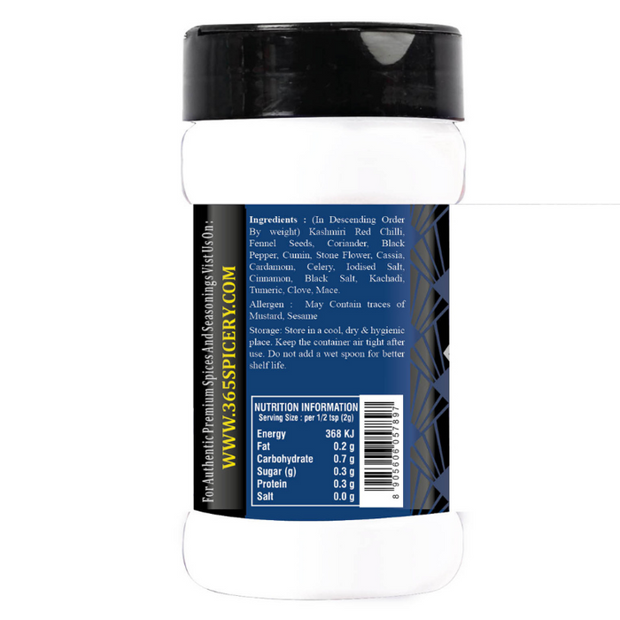 - Contains Kashmiri Red Chilli, Fennel Seeds, Coriander, White Pepper, Cumin, Stone Flower, Cassia, Cardamom, Celery, Iodised Salt, Cinnamon, Black Salt, Kachadi, Tumeric, Clove, Mace