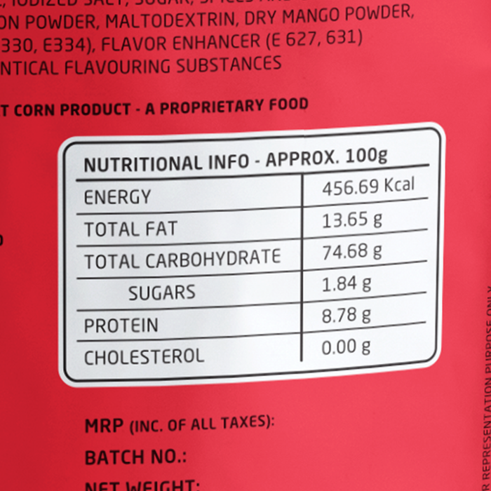 - Contains popped corn, refined edible palmoline oil, iodized salt, sugar, maltodextrin, hydrogenated vegetable fat, milk solids, dextrose, acidity regulator (e270), flavour enhancer (e 627, 631), natural colour (e160c, e100) added natural and nature identical flavouring substances.